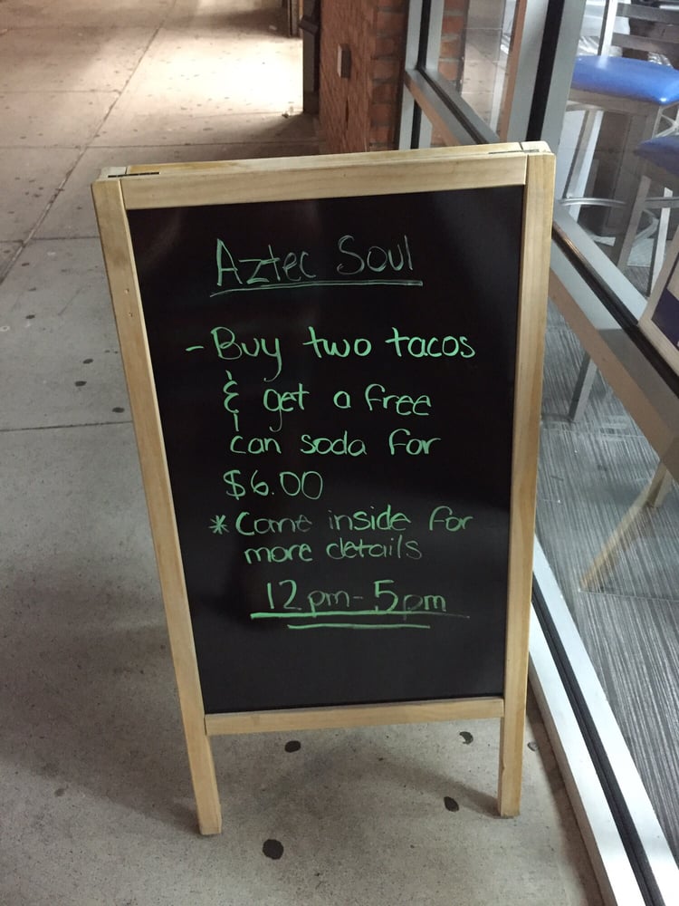 “ I needed some lunch while waiting for my car to be repaired down the block. I walked around the area and all I could find were bodegas for taking out food. I wanted a place to sit down and eat, that's when I noticed Aztec Soul. After looking at their menu I went in and ordered some Tacos al Pastor. Tacos al Pastor is one of my favorite tacos and my gauge as to how good a Tex-Mex restaurant is. Well I must say they make a very good Taco al Pastor here. The pork was seasoned just right and they also use pineapple. I've been told by an experienced Mexican chef that pineapple is not traditional on Tacos al Pastor because pineapples are not grown in Mexico. But most Tex-Mex places use it and I like the flavor combination. The flower tortillas were fresh and appeared to be home made. I also tried their hot sauces they were quite a good addition to my tacos. The restaurant was clean and appears to family owned and run. The next time I'm in the area at lunch time I'll be sure to stop in and try some of their other items. I was impressed with my first visit. ”